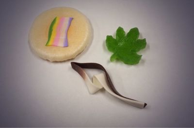 七夕の起源の一つ「乞巧奠」の飾り付けで、梶の葉には和歌を書き、五色の薄布をかけて、その他にも角盥、琵琶、箏などを配して、裁縫、染め、和歌、演奏などの上達を願ったといわれています。