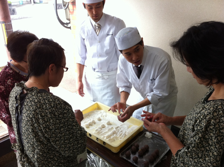 当店の職長と職人がお手伝いをして、おまんじゅうの皮で餡を包んでいただき