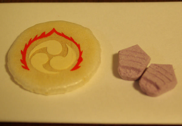 今日upしたのは、「鼉太鼓」と「三番叟」です。麩焼きのせんべいには太鼓の巴と火炎をそれぞれの色で刷り込み和三盆の打ち物は烏帽子の形で、三番叟の銘をいただきました。