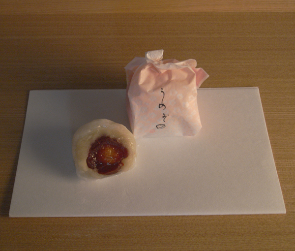 柔らかく蜜煮した甘酸っぱい「古城梅」を包んだ和菓子です。
