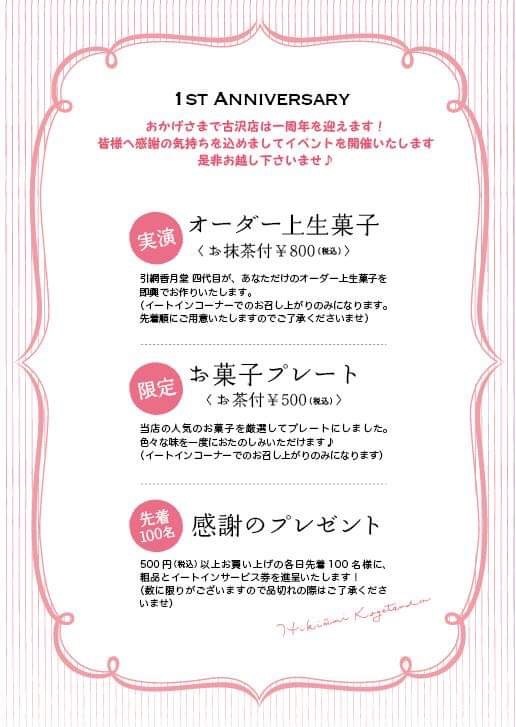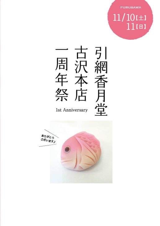 今週末10日(土)11日(日)は「引網香月堂古沢本店1周年祭」を開催させていただきます。お客様のご愛顧をいただき、おかげさまで1周年を迎える事が出来ました。