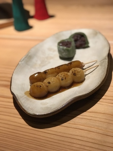 串団子に仕上げ、少し出汁の効いた甘辛のみたらしを絡めた品を
