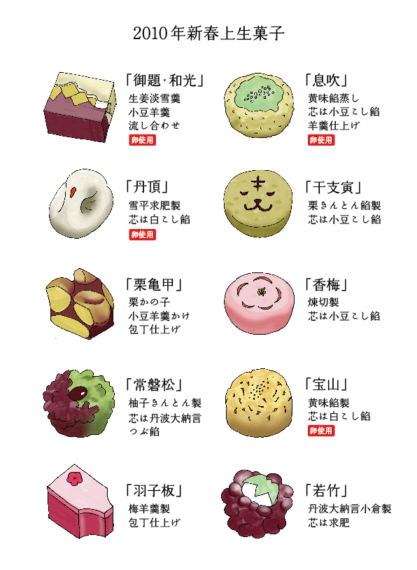 明日は大晦日。今度こそ年内最終upです。今年の新春上生菓子の図案しおりです。数に限りはありますが、お買い上げいただいたお客様に同封しております。