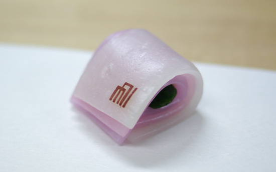三色の「ういろう」で衣の袖を表し源氏香の「初音」を刷り込んであります。芯に巻いた餡は「よもぎ餡」