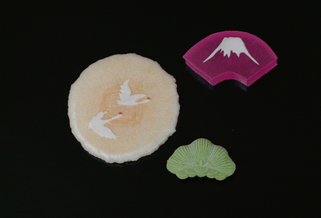 右上から「舞扇(扇面に富士)、飛翔(双鶴)、常磐(松)」